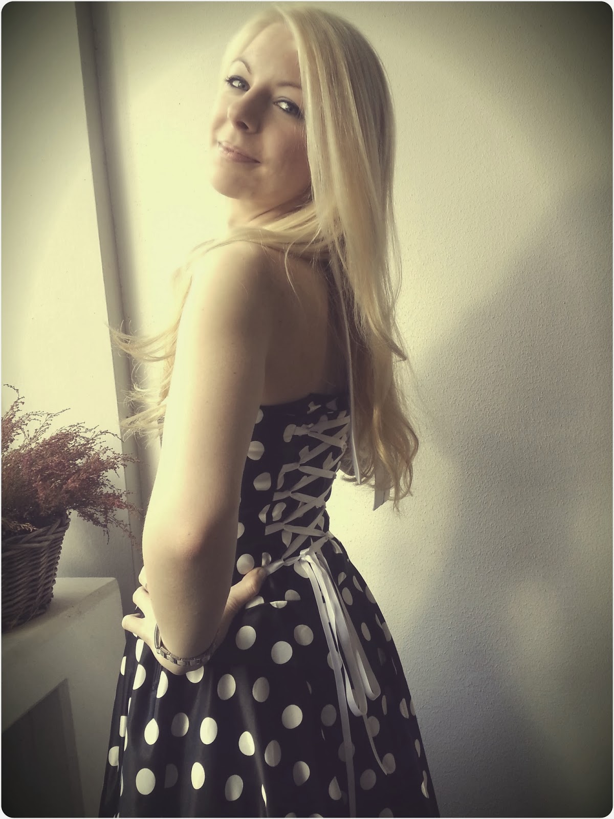 Ich habe es nach dem gleichen Schnitt genäht wie mein Marienkäfer-Carrie-Kleid und nur ein paar Variationen eingefügt. So habe ich das Kleid am Rücken mit einer Schnürung versehen und auch den Neckholder als Schleife gestaltet. Zur Dekoration habe ich über dem Saum ein schmales Satinband und am Ausschnitt eine weiße Blende angebracht.